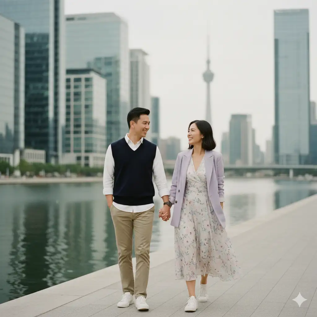 A modern, romantic couple’s portrait taken outdoors by a waterfront in an urban cityscape. The man and woman walk hand in hand, smiling warmly at each other, with a tall communication tower rising gracefully in the background. The man wears a white shirt layered under a dark navy sweater vest, paired with beige chinos and white sneakers, giving a clean and casual look. The woman wears a soft floral midi dress with a lilac blazer and white sneakers, her hair cut in a short, elegant bob. The background features calm water, a skyline of modern buildings, and the iconic tower softly blurred to create depth. The lighting is natural and even, suggesting a slightly overcast day, which enhances the muted, cinematic tones of the scene. The moment captures effortless connection, joy, and stylish simplicity.