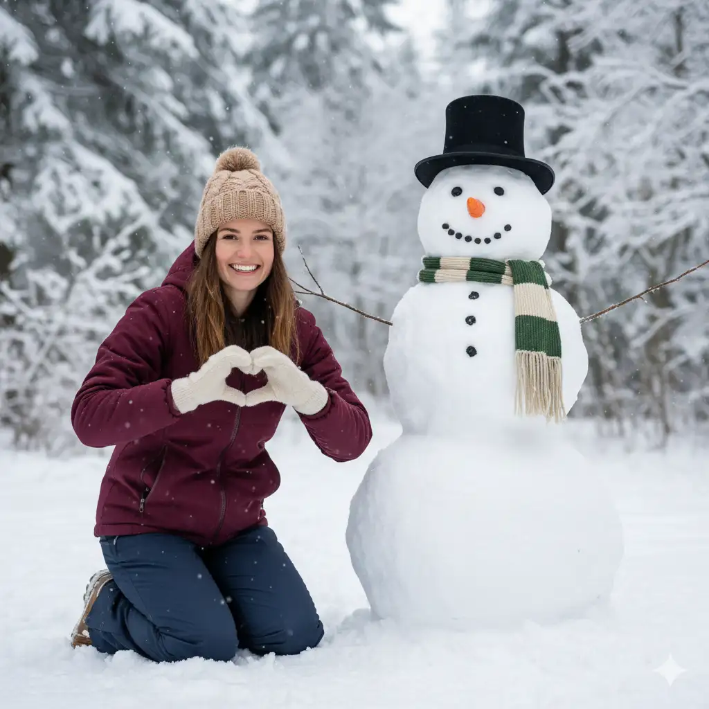 Create a cheerful winter portrait of a young woman kneeling in fresh snow beside a classic snowman. She wears a warm beige knitted beanie, cream-colored gloves, a deep burgundy winter jacket, and navy snow pants. She forms a heart shape with her gloved hands while smiling brightly at the camera, giving the scene a joyful, wholesome feel. The snowman next to her is built with smooth, rounded snow layers and decorated with a black top hat, a green-and-cream striped scarf, a carrot nose, coal eyes, and a dotted coal smile. Thin twig arms extend outward. Behind them, a serene snow-covered forest fades into a soft blur, with tall trees coated in heavy white frost.