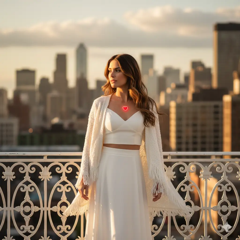 Create a chic urban rooftop portrait of a woman standing confidently against an ornate white railing with a softly blurred city skyline in the background. She wears a stylish white outfit — a fitted crop top paired with a high-waisted skirt and a textured fringed cardigan that adds movement and softness to the composition. Her long, wavy hair cascades over her shoulders, and a delicate red heart-shaped pendant adds a striking contrast to her monochrome look. The lighting is warm and natural, highlighting her features and giving the image a refined, modern elegance. The mood is poised, cinematic, and fashion-forward.